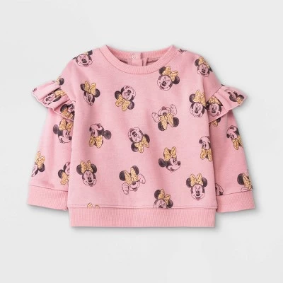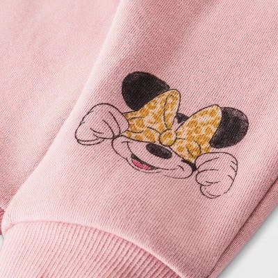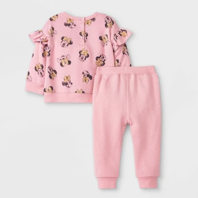 - Baby girls’ top and bottom set includes a Minnie Mouse-print fleece sweatshirt and joggers