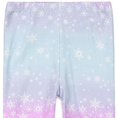 - Ruffle peplum top with soft hand screen print artwork featuring Elsa with glitter snowflakes and the phrase “I am fearless,” plus sky blue leggings with an all-over snowflake print.