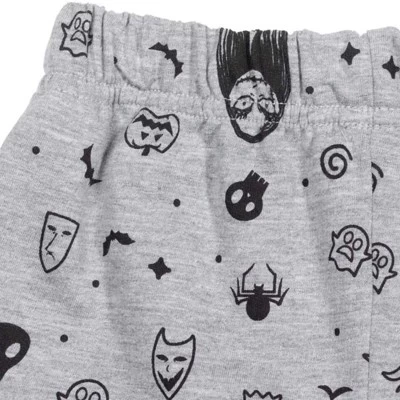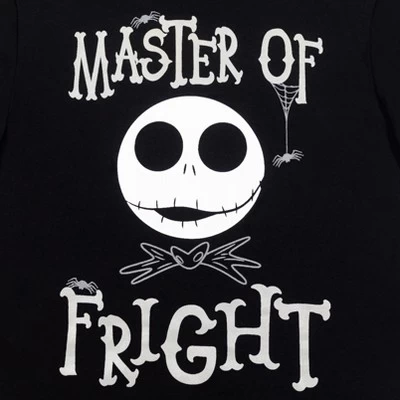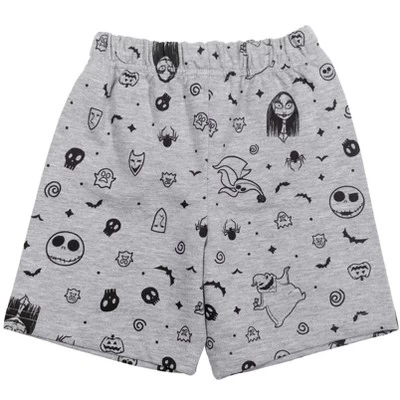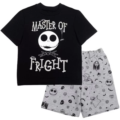 - Featuring Jack Skellington, the Pumpkin King, with spiders and the words “Master of Fright” on black shirt; Spooky all-over print of pumpkins, Jack Skellington, Sally, ghosts, bats, masks, swirls and dots on grey shorts