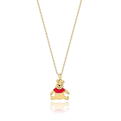 - A necklace for Winnie the Pooh lovers. This pendant necklace features a yellow gold-plated sterling silver Pooh pendant. Sitting Pooh pendant is wearing his signature red T-shirt
