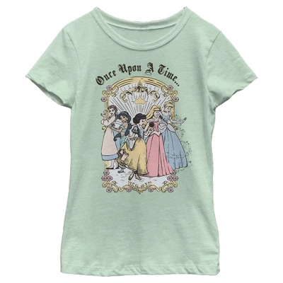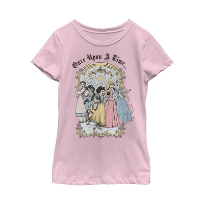 - Strut your stuff with this stylish new every day girls’ t-shirt that is perfect for every occasion! Featuring Jasmin, Cinderella, Aurora, Belle, and Snow White are featured in a retro art style with the phrase: “Once Upon a Time,” above them.