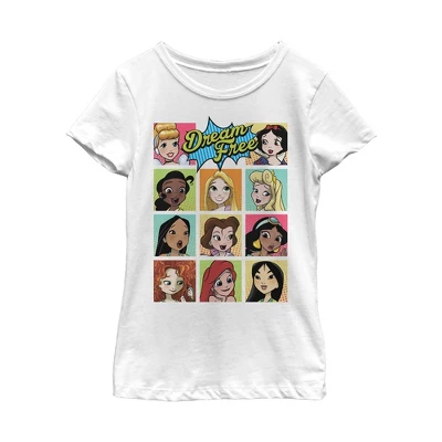 - Strut your stuff with this stylish new every day girls’ t-shirt that is perfect for every occasion! Featuring Cinderella, Snow White, Tiana, Rapunzel, Aurora, Pocahontas, Belle, Jasmine, Merida, Ariel, and Mulan in a comic art style with the text: “Dream Free,” above them.
