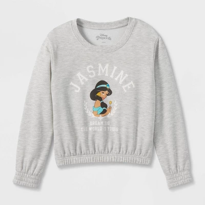 Keep them warm and cozy in Disney-inspired style with this Heathered Gray Disney Princess Jasmine Dreamy Fleece Pullover. This long-sleeve pullover sweatshirt updates their casual cool-weather wear. Styled with a round neck, it features a cute print of their favorite Disney princess character, Jasmine, along with Jasmine’s name and the text “Dream Big The World Is Young” on a heathered gray backdrop for a playful look. The soft fleece fabric keeps them warm and comfy, while the cinched hemline and cuffs provide a snug fit. They can pair this sweatshirt with jeans, leggings or fleece joggers to create an array of cute and cozy looks.